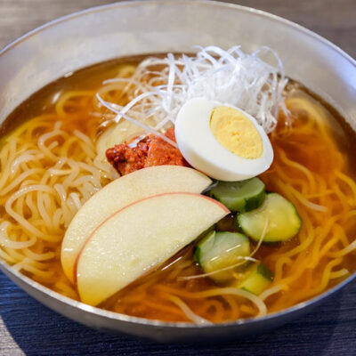 平壌冷麺は「水冷麺(ムルレンミョン)」とも呼ばれ、やわらかな食感となめらかな喉ごしが特徴の冷麺。