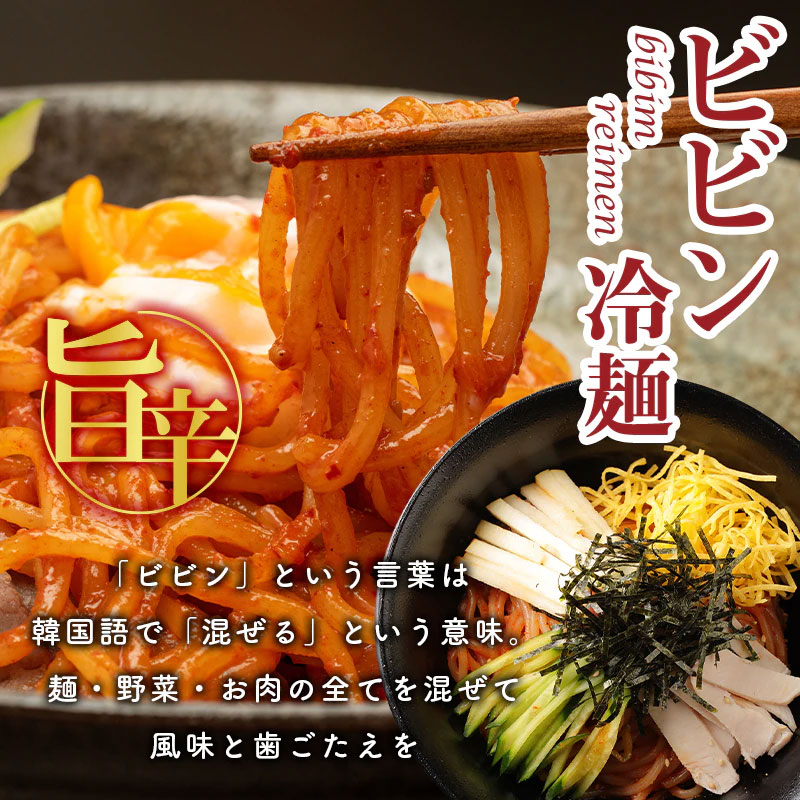一方、ビビン麺はスープではなくタレで食べ、辛味が強いのが特徴です。