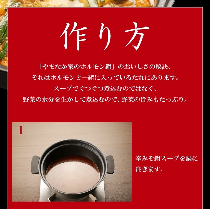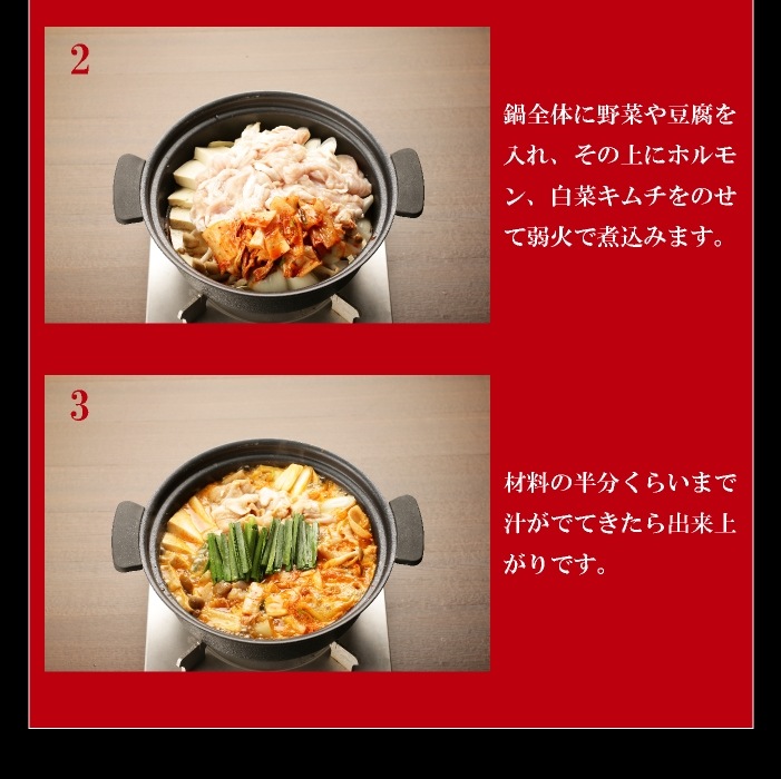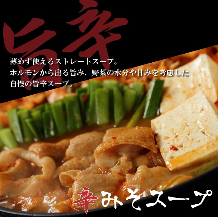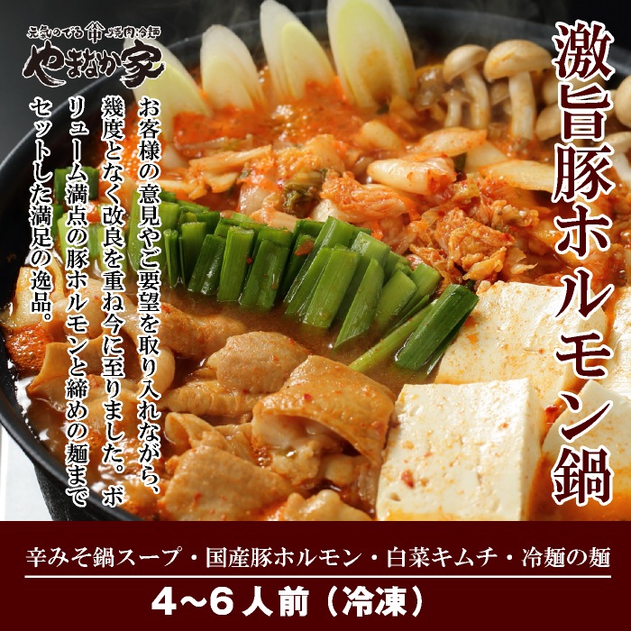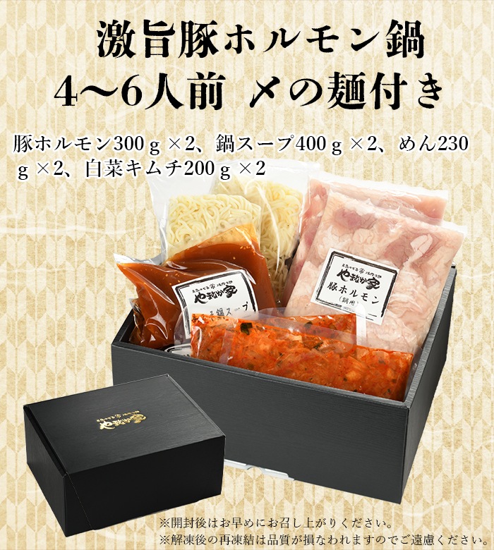 4~6人前(豚ホルモン300g×2、鍋スープ400g×2、めん230g×2、白菜キムチ200g×2) |
