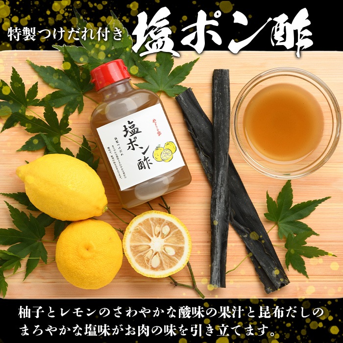 特製のつけだれをご一緒に。柚子とレモンのさわやかな酸味の果汁と昆布だしのまろやかな塩味がお肉の味を引き立てます。 塩ポン酢つけだれでいただく際は、 鍋のスープ等を入れてお好みの濃さに調整してお召し上がりください。