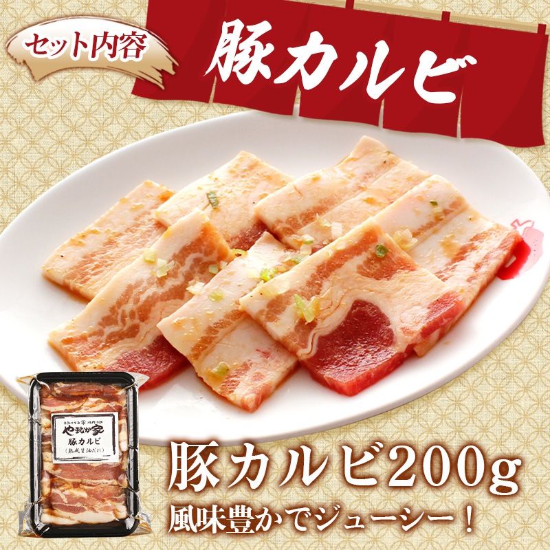 牛ハラミステーキ200g、国産牛カルビ200g、牛タン切り落とし200g、三元豚カルビ200g、牛ホルモン200g、元祖本だれ100g