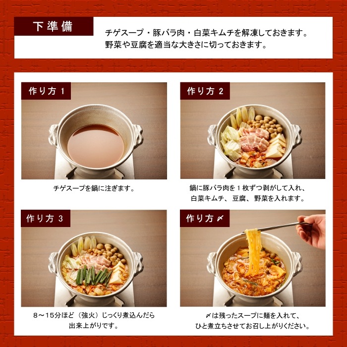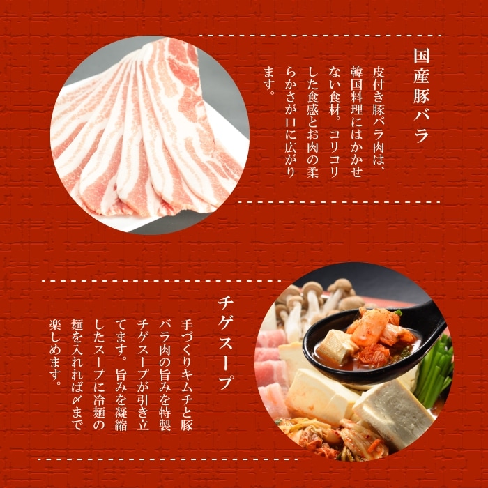 4人前(チゲスープ400g×2、めん230g×2、豚バラ200g×2、白菜キムチ200g×2) |