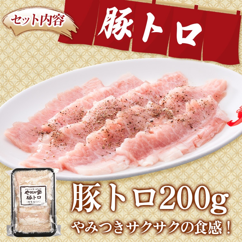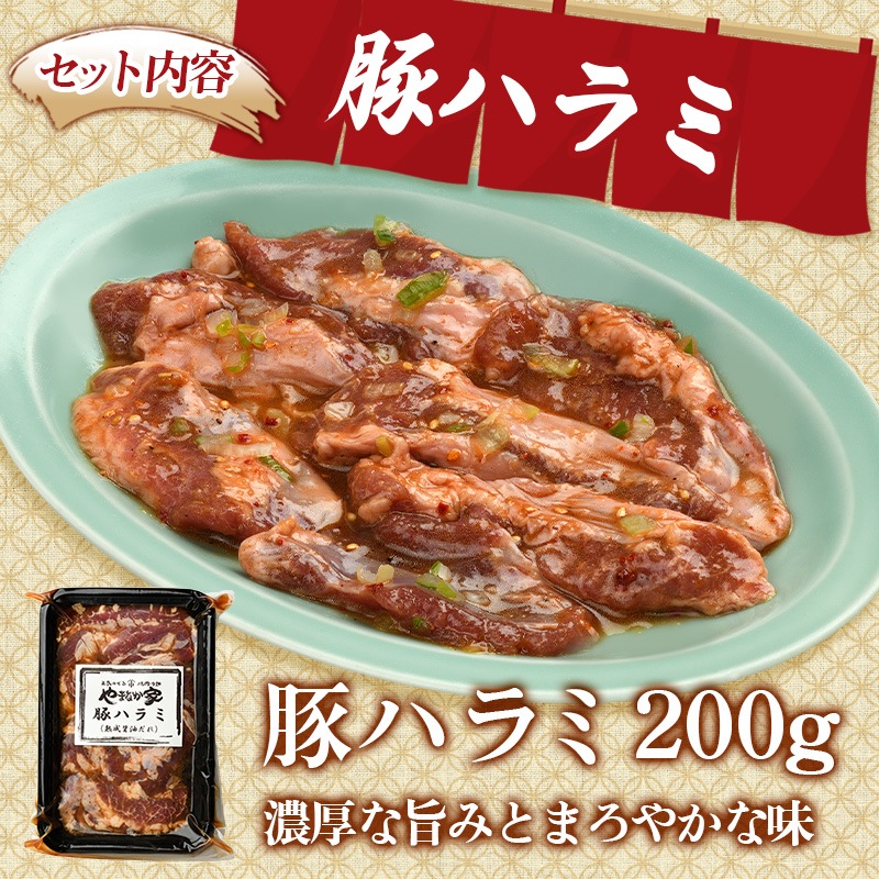 牛タン切り落とし200g、元氣カルビ200g、ハラミステーキ200g、豚トロ200g、豚カルビ200g、豚ハラミ200g、鶏ハラミ200g |