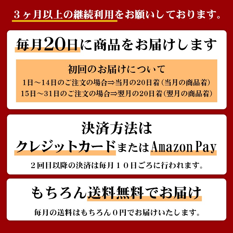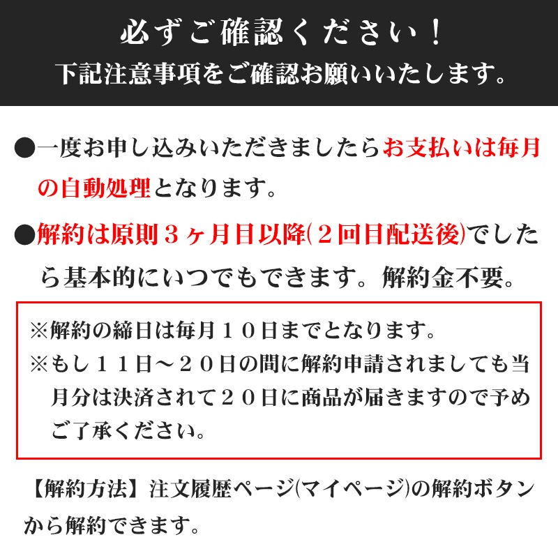 ※もし11日~20日の間に解約申請されましても、当月分は決済されて20日に商品が届きますので予めご了承ください。