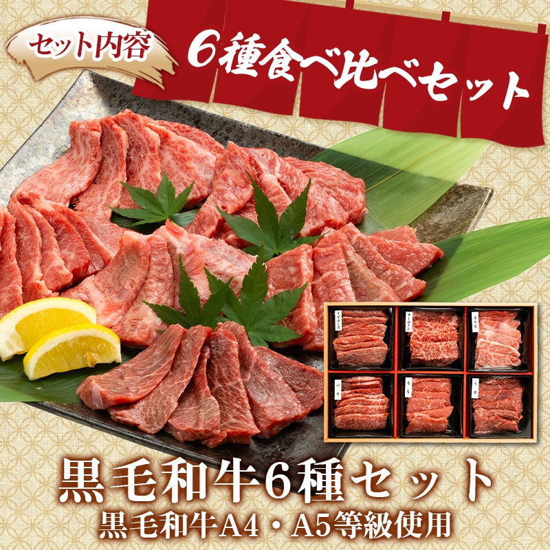黒毛和牛6種セット:サーロイン80g、カルビ80g、もも80g、リブロース80g、バラ80g、うで80g、秘伝濃口だれ210g 極上牛たん500g |