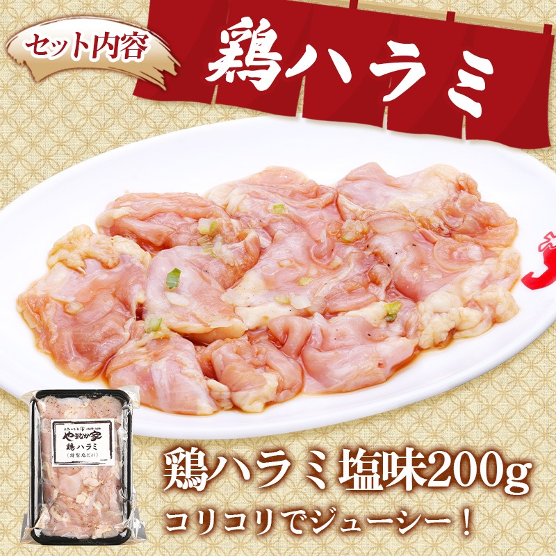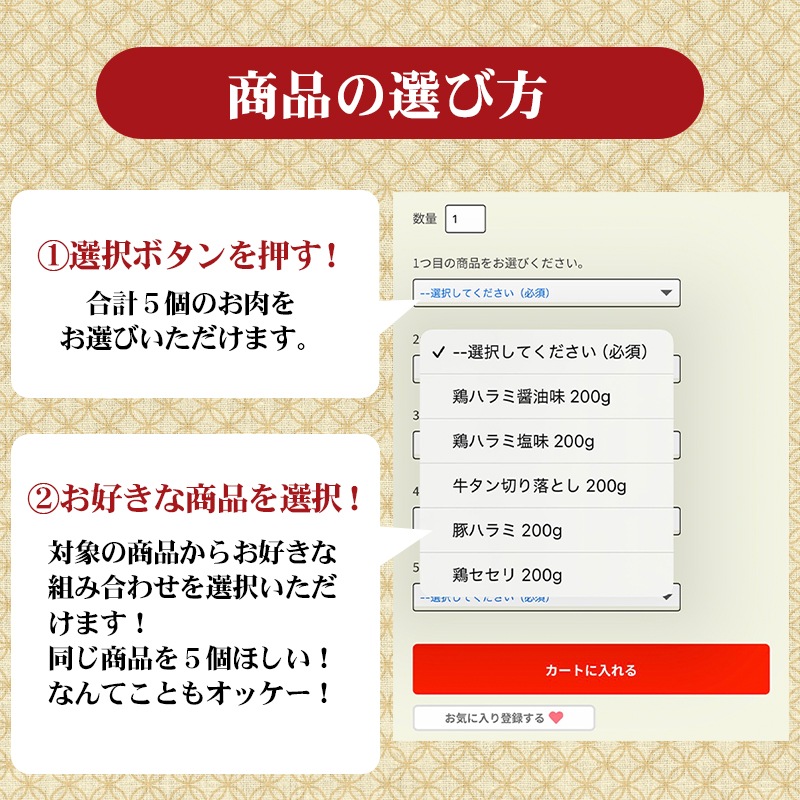 | 内容量 | 鶏ハラミ醤油、鶏ハラミ塩、牛タン切り落とし、豚ハラミ、鶏セセリ(お好きな商品を5個、各200g) |